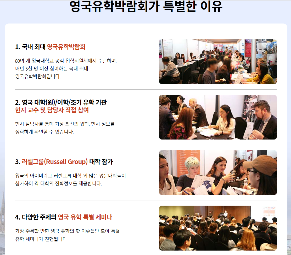1) 국내 최대 영국 대학교 공식 입학 지원처가 주관하며 매년 5천 명 이상 참여하는 전통있는 국내 최대 규모 영국 유학 전문 박람회