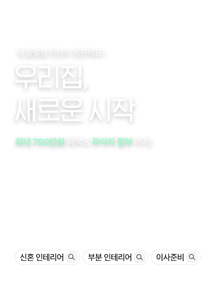 새로운 시작을 준비하고 계신다면? 새 출발을 한샘이 응원해요! 이달의 구매 혜택 최대 700만원! 500만원 미만 구매 시, 10만원 상품권 증정! 500만원 이상 구매시 최대 30만원 할인 1000만원 이상 구
