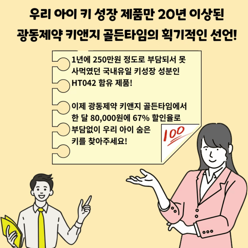 키성장제품, 왜 이렇게 비쌀까요? 왜 꼭 1년치를 한꺼번에 사야 할까요? 그래서 광동에서 준비했습니다. 무료체험 혜택과 67% 할인 혜택을 모두 받아가세요! 키성장제품만 20년! 광동제약 키앤지