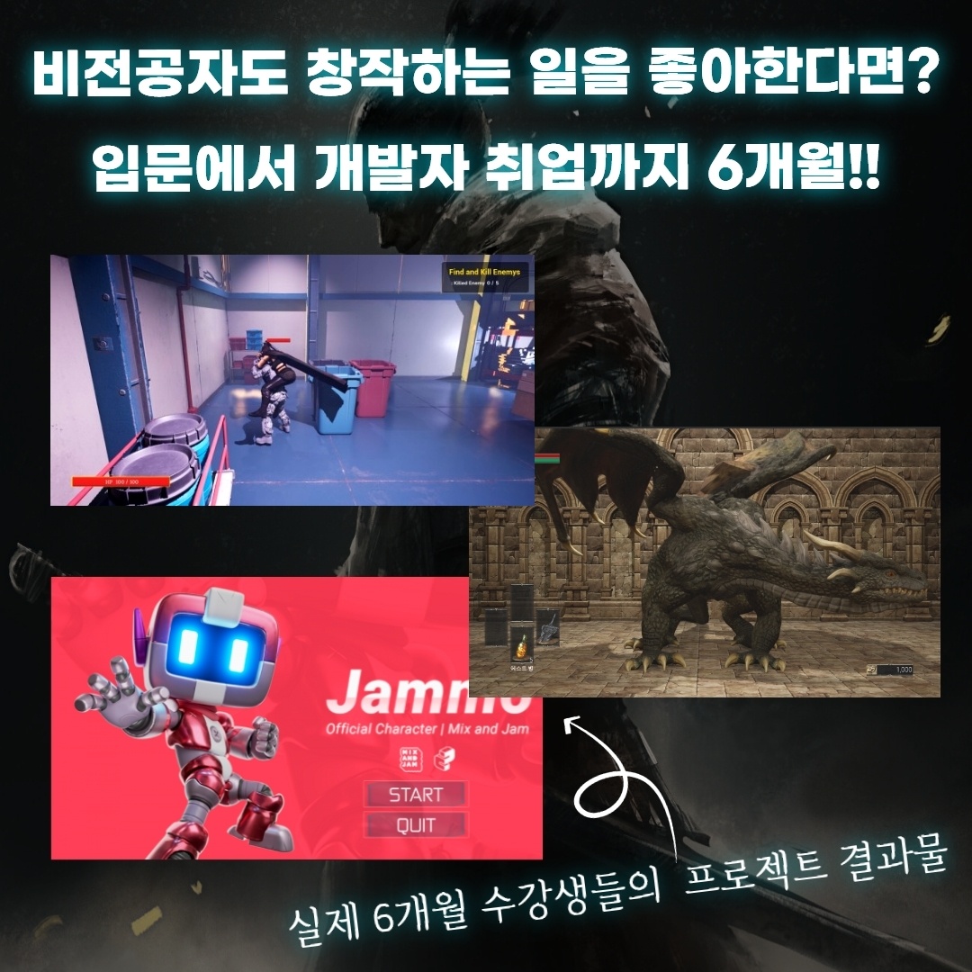 고용노동부 지원 국민내일배움카드 발급 가능자들을 대상으로 진행하는 IT기업취업 전액지원교육 서울 가산디지털단지에서 7개월 간 대면 수업으로 진행되며 언리얼엔진을 활용하여 게임, 메
