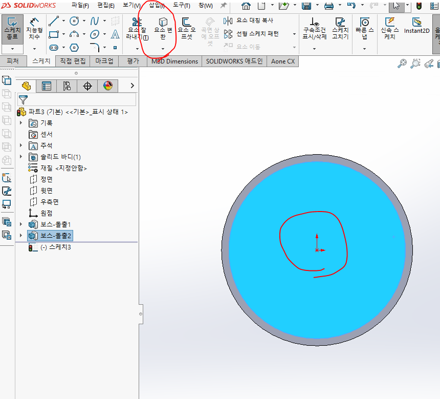 간단한 스프링을 그려 봅시다. 1. 내원이 될지 외원이 될지 모를 원을 그립니다. 원을 그리고 나서 내측 사이즈가 될지 외측 사이즈가 될지는 나중에 결정하면 됩니다. 스케지를 나가서 피처 →
