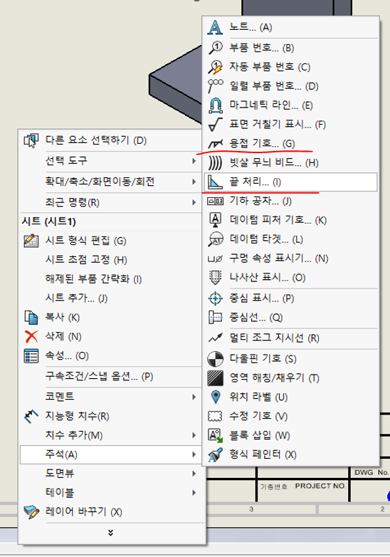 도면의 바탕에 아무것도 활성화되지 않은 상태에서 우클릭을 하면 아래의 그림처럼 용접 기호와 끝처리 메뉴가 보일 것입니다.