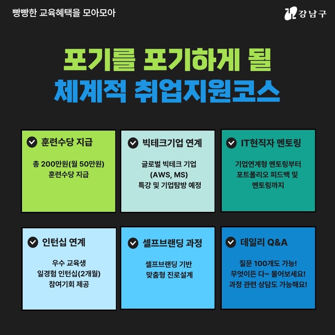 국비지원 교육은 다 똑같다?! 강남에서만 가능한 올-인원 취업패키지가 있습니다!! 실무에 바로 적용 가능한 프로젝트 중심 교육! 셀프 브랜딩 기반 맞춤형 직무 진로 설계! 인턴십 연계까지
