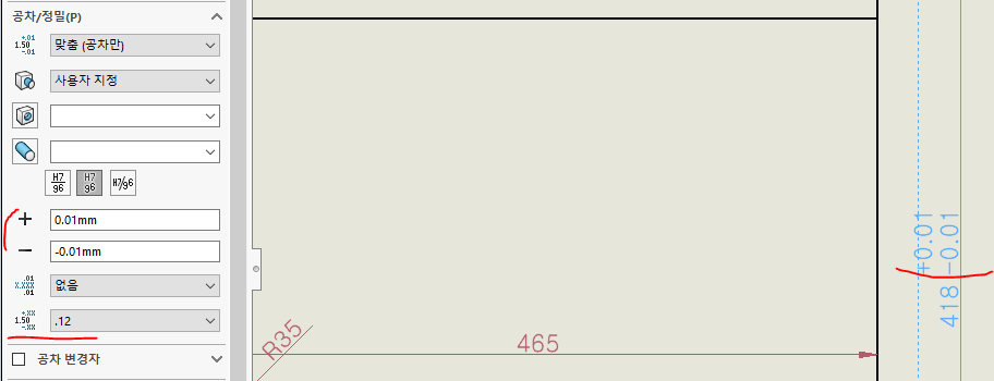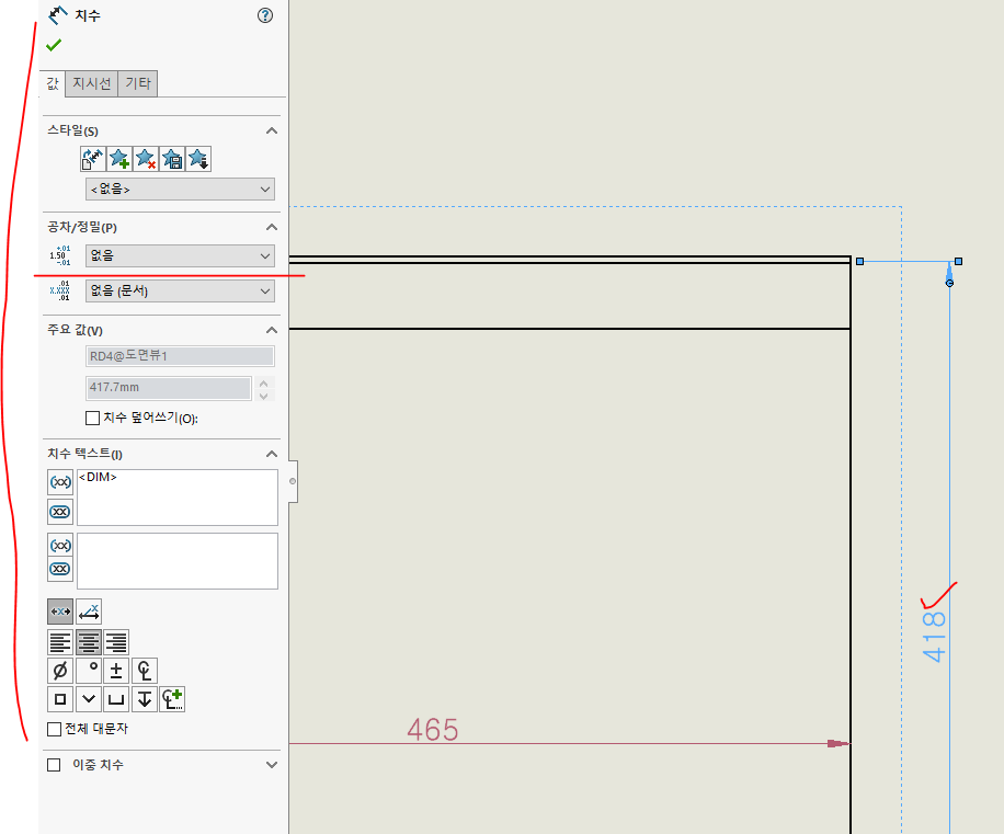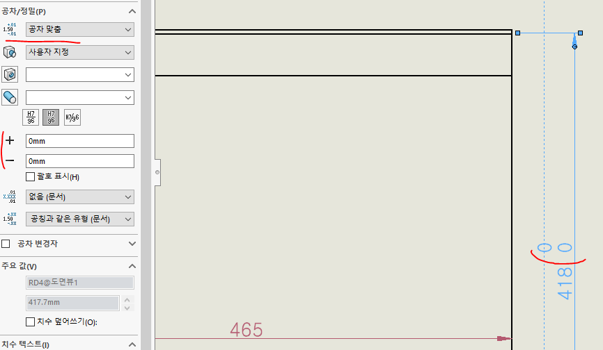 치수를 클릭하면 좌측에 설정이 활성화 됩니다. 공차/정렬에서 공차를 없음을 공차 맞춤을로 변경하면