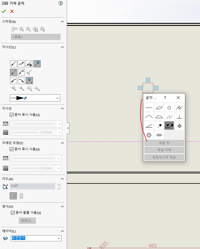 예제로 직각을 클릭하고 수직(90도)의 공차를 입력하고 데이텀(기준)이 있다면 데이텀을 정의하면 됩니다.