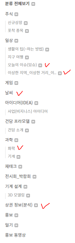 아래 체크 5 항목을 정리하면 조금 편해질 수도 있을 것 같다....솔직히 너무 많은 카테고리로 내 목을 조르고 있었을 지도.....모른다....포스팅 해야만 한다는 일념 하나로 초 집중 해서 초보 티는 벗은 것 같다....스스로 대견 하다고 칭찬 한다...ㅋㅋㅋㅋ