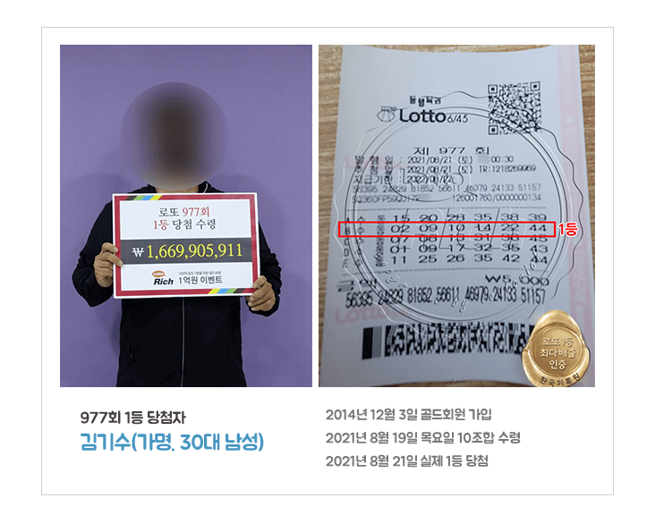 해당 기록은 WRC 세계기록위원회와 KRI 한국기록원에서 공식적으로 인증 받으며 투명성을 보장하고 있다. 982회에서 1등에 당첨된 심소연씨를 포함한 127명의 1등 당첨자들은 로또리치에서 발표되는 당첨 성적과 증빙자료를 보고 처음 가입했다고 밝혔으며, 가입한지 평균 21개월만에 1등에 당첨된 것으로 나타났다.