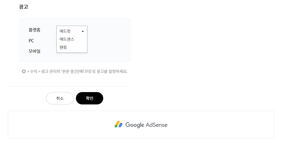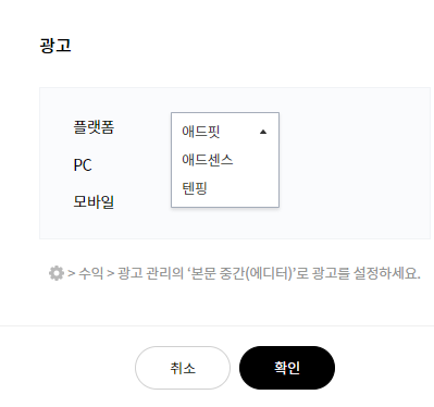 그리고 광고는 각 글당 광고(카카오, 애드, 텐핑, Dable) 1개씩만 넣을 수 있습니다.