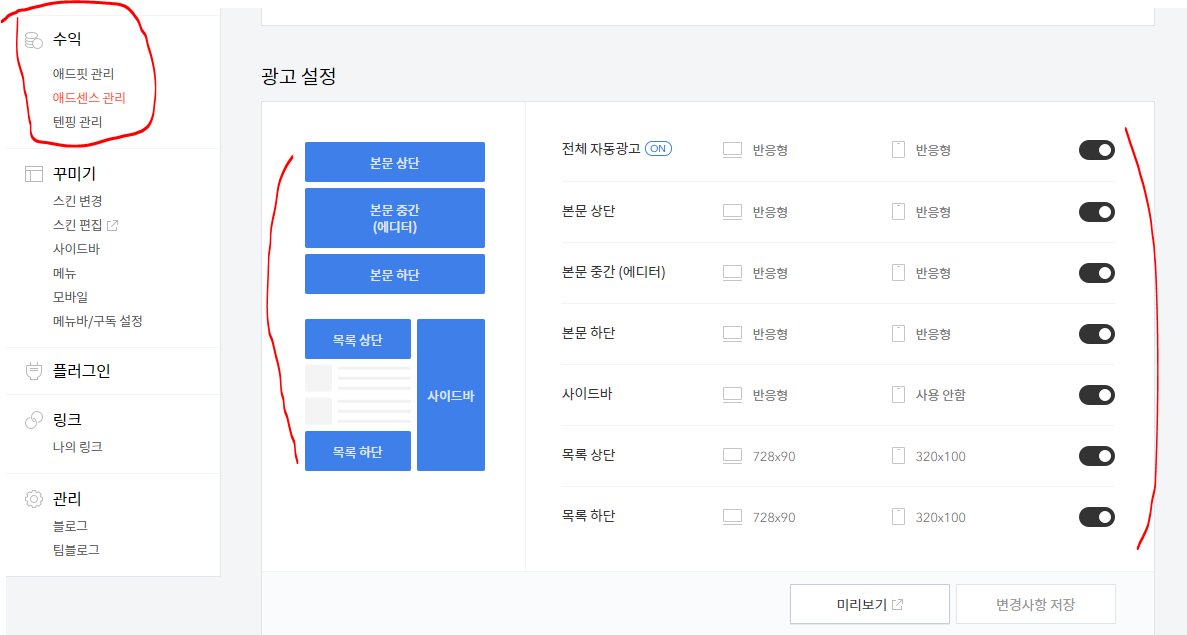 2) 현재 블로그 홈에 좌우, 목록, 사이드바에 광고가 나오고 있는가요?