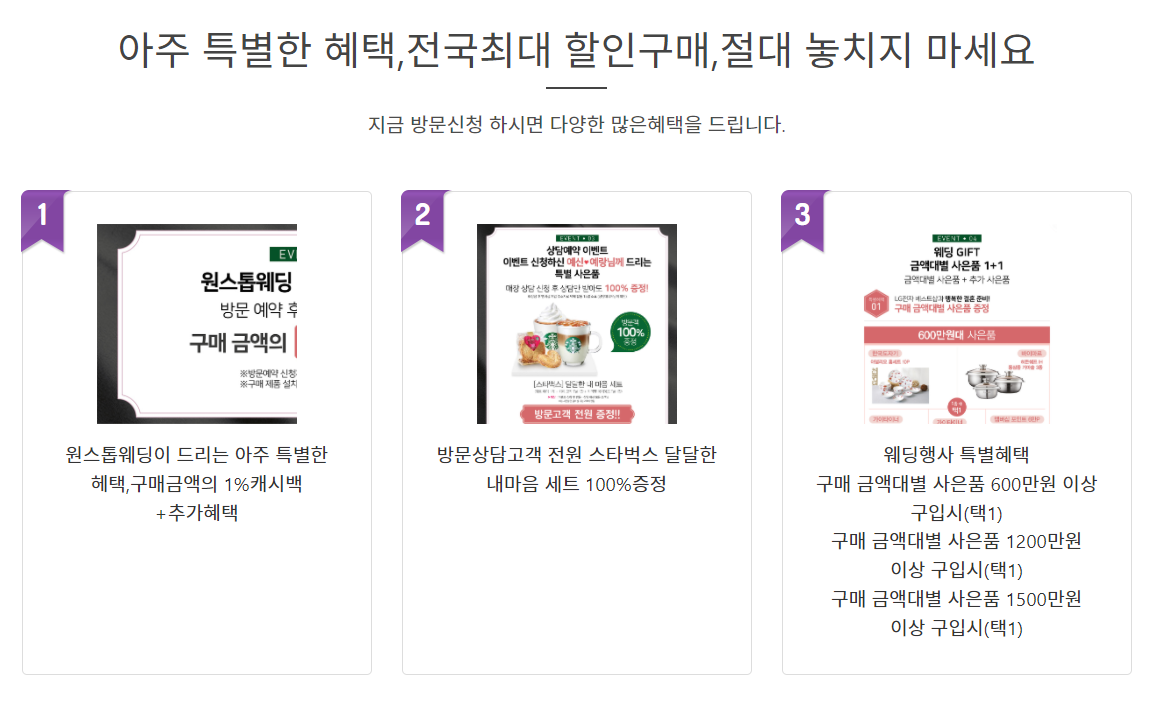 방문상담만 해도 스타벅스 세트를 드리고,푸짐한 사은품과,원스톱웨딩 만이 드릴수있는특별한 캐시백,