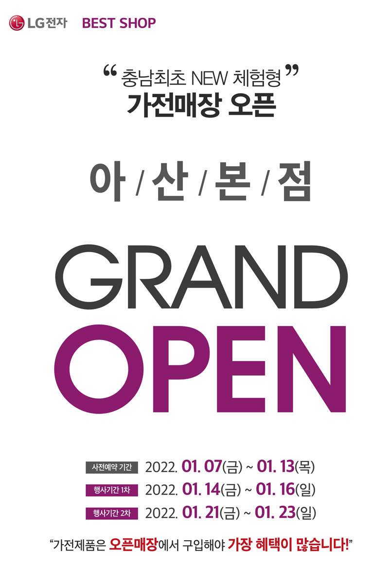 LG전자 아산본점 GRAND OPEN LG전자 충남최초 아산본점 GRAND OPEN 특별행사 LG전자 충남최초 아산본점 GRAND OPEN 특별할인+1%캐시백+추가할인 LG전자 GRAND OPEN 할인+원스톱 추가할인 혼수고객 초대전 LG가