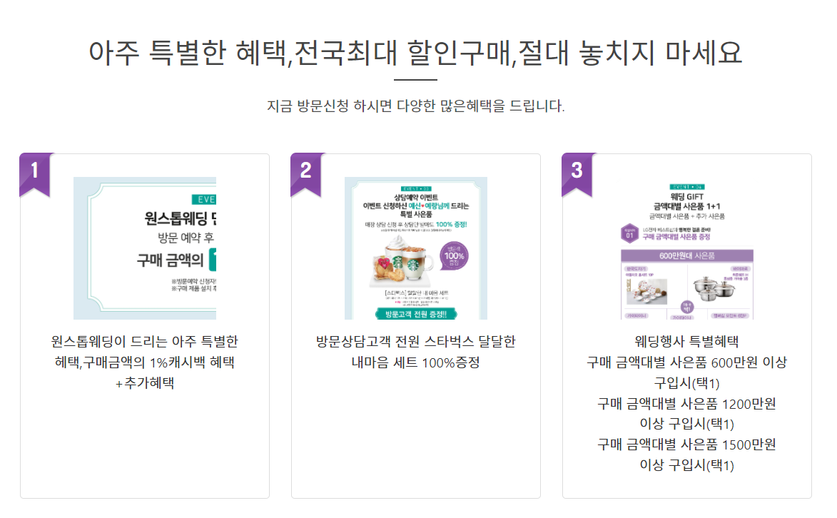 방문상담만 해도 스타벅스 세트를 드리고,푸짐한 사은품과,원스톱웨딩 만이 드릴수있는특별한 캐시백,