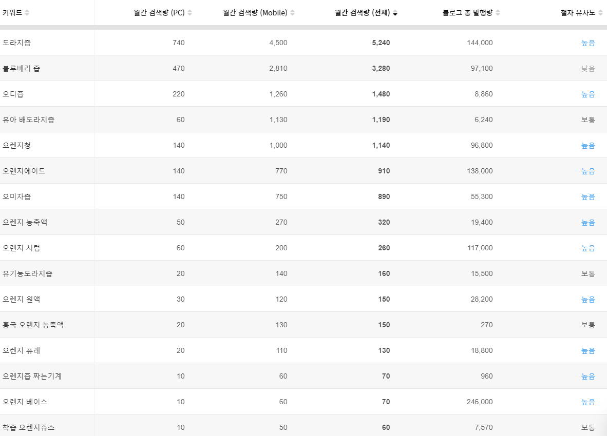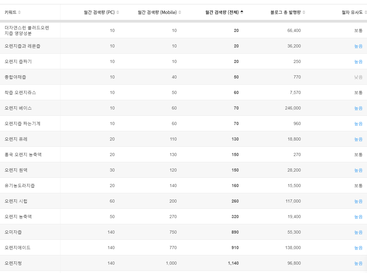 PC+핸드폰 합쳐서 월 검색량이 320건인데 블로그 총발생량이 19,400개입니다. 결론은 "오렌지 즙"을 검색 상위에 올리려면 엄청난 노력이 필요하다는 것입니다.