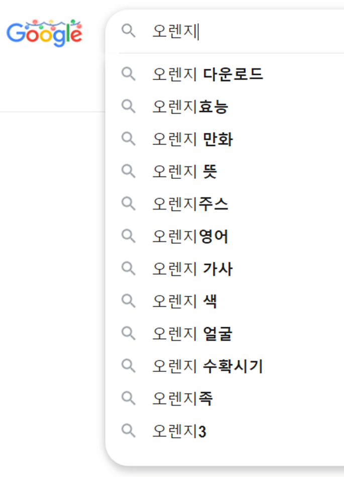 예를 들어 내가 지금 "오렌지 즙을 짜는 기계와 후기"를 알고 싶다면 검색창에 "오렌지"만 검색창에 적어도 수 많은 단어들이 자동 나열됩니다. 이 중에서 내가 원하는 단어가 있다면 클릭 하라는 겁니다. 만약 "즙"이라는 단어까지 넣으면 어떻게 될까요?