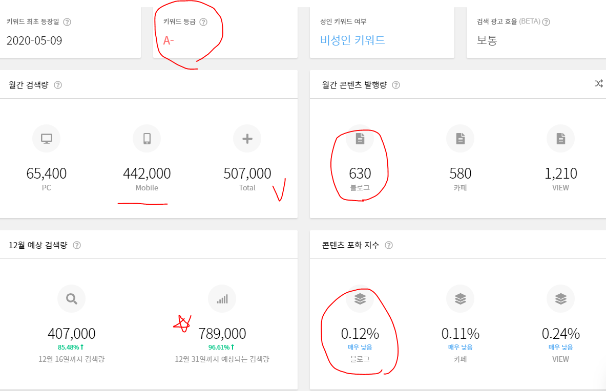 1) 키워드 등급 A-. (다른 주제와 비교해 보면 A-등급은 좋은 등급의 키워드입니다.)