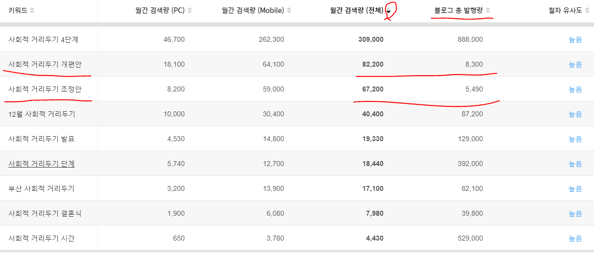 사회적 거리 두기 관련하여 핸드폰 검색이 월 120만 건, PC가 28만 건/ 관련 콘텐츠가 월 27,200개씩 쏟아지고 있는 주제입니다. 블로그 하기에는 경쟁 상대가 많지만 주제를 골랐으니 검색 상위에 올릴 수 있는 주제(키워드)를 찾아봅시다.