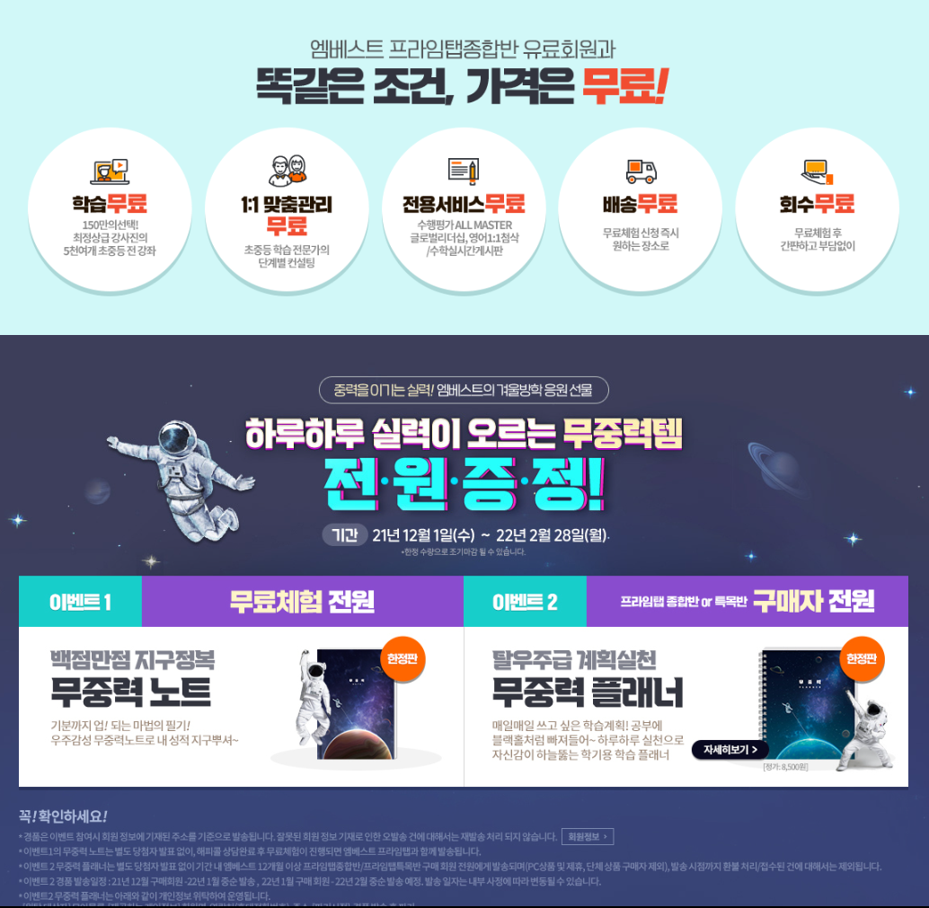 엠베스트의 모든 콘텐츠에 비교과 전용 콘텐츠까지 이용할 수 있는 엠베스트 프라임 탭도 무료로 체험할 수 있는 기회를 드립니다. (배송부터 회수까지 무료)