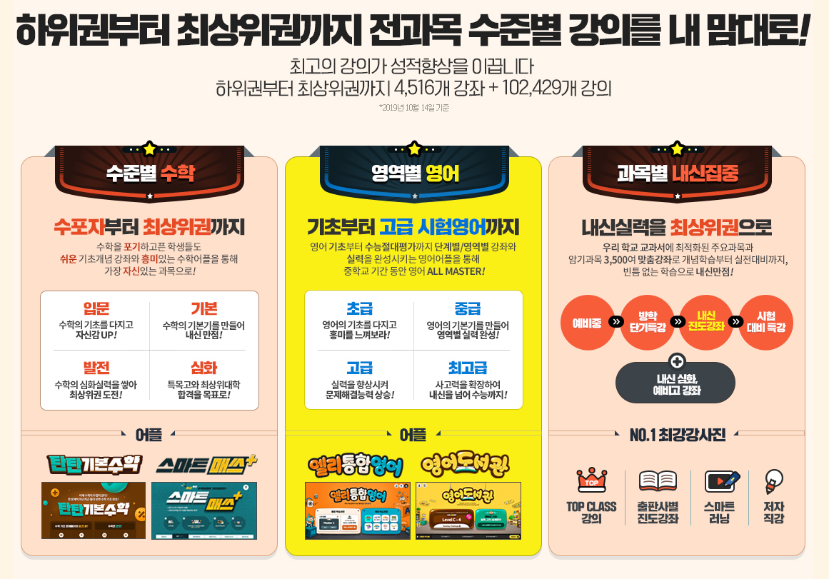 전 과목 내신 대비부터 특목·자사고 입시 대비까지 국내 1등 선생님의 5천여 개의 강좌가 있습니다.