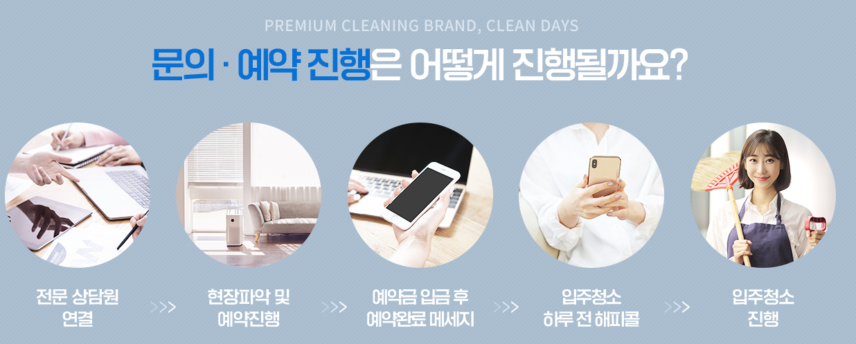 프리미엄 청소 브랜드 "클린데이즈" 내게 딱 맞는 맞춤형 견적! 1:1 고객 맞춤 컨설팅 -홈 클리닝 (입주 청소/이사 청소/거주 청소/사무실 청소) -오피스 클리닝 (사무실·상가·의자·바닥 왁싱·파