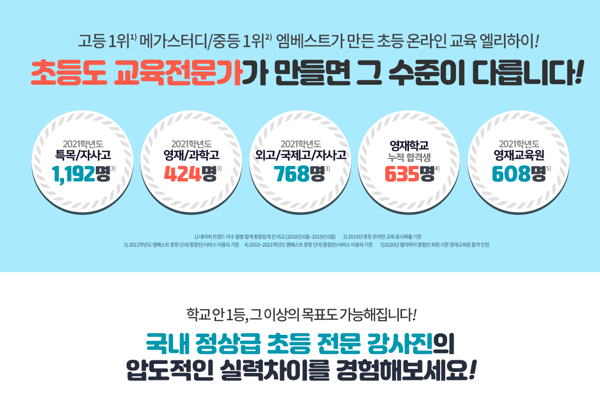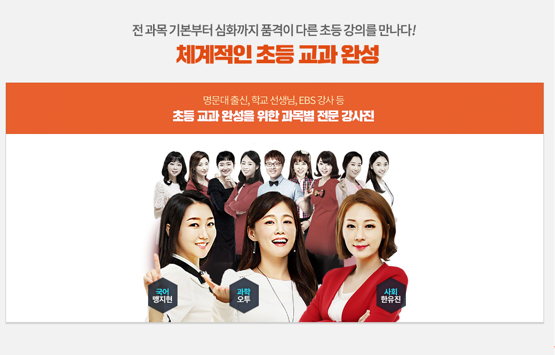 [초등 전 학년 전 과목 자유 수강] - 스타 강사진의 전 학년 전과목 내신대비부터 비교과 콘텐츠로 학교 공부 완성 - 영·수 특화 콘텐츠와 특목·자사고 입시 대비까지 - 개인별 진도에 맞춰 선택