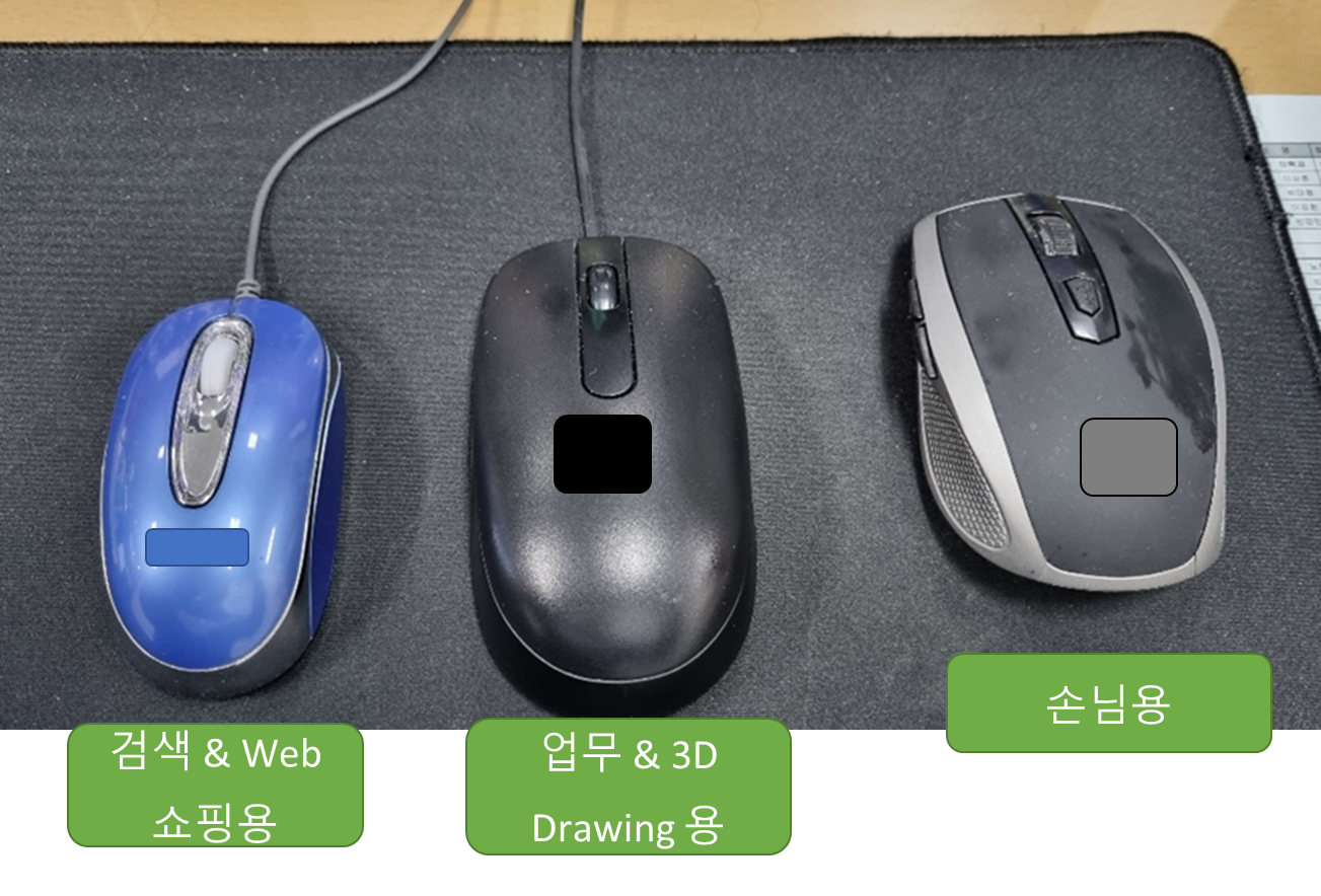 그리고 업무에 주로 쓰는 마우스가 중간 마우스다. 약간의 무게감이 있어서 설계할 때 잘 사용한다.