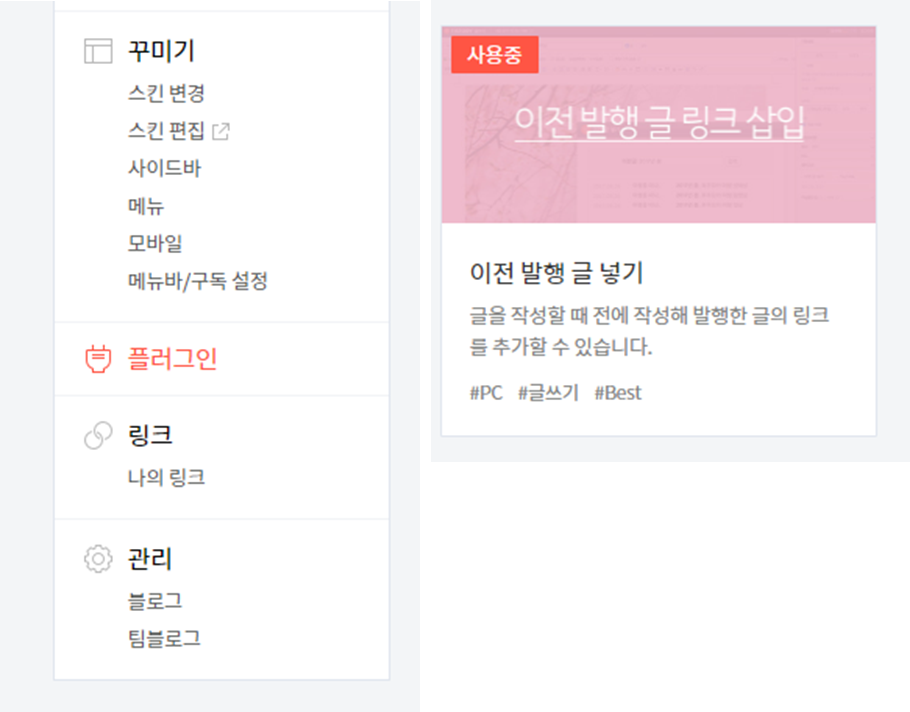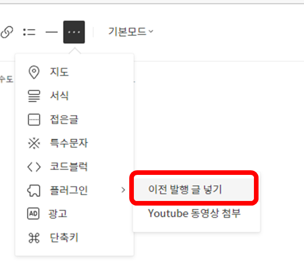 ☆ 또다른 삭제된 글 복구 방법은, 티스토리의 글 쓰기에서 하기 그림과 같이 메뉴 우측 상단 점 3개를 클릭하면 추가 메뉴가 나타나는데 플러그인에 이전 발행글 넣기를 클릭하면 지금까지 작성해 놓은 글들을 볼 수 있습니다. 단! 관리자 설정의 플러그인 옵션에서 그림과 같이 "이전 발행글 링크 삽입"이 사용중에 있어야 가능한 복구 방법입니다.(왠만하면 이 옵션은 활성화 시키시는게 나중을 위해 좋습니다.)