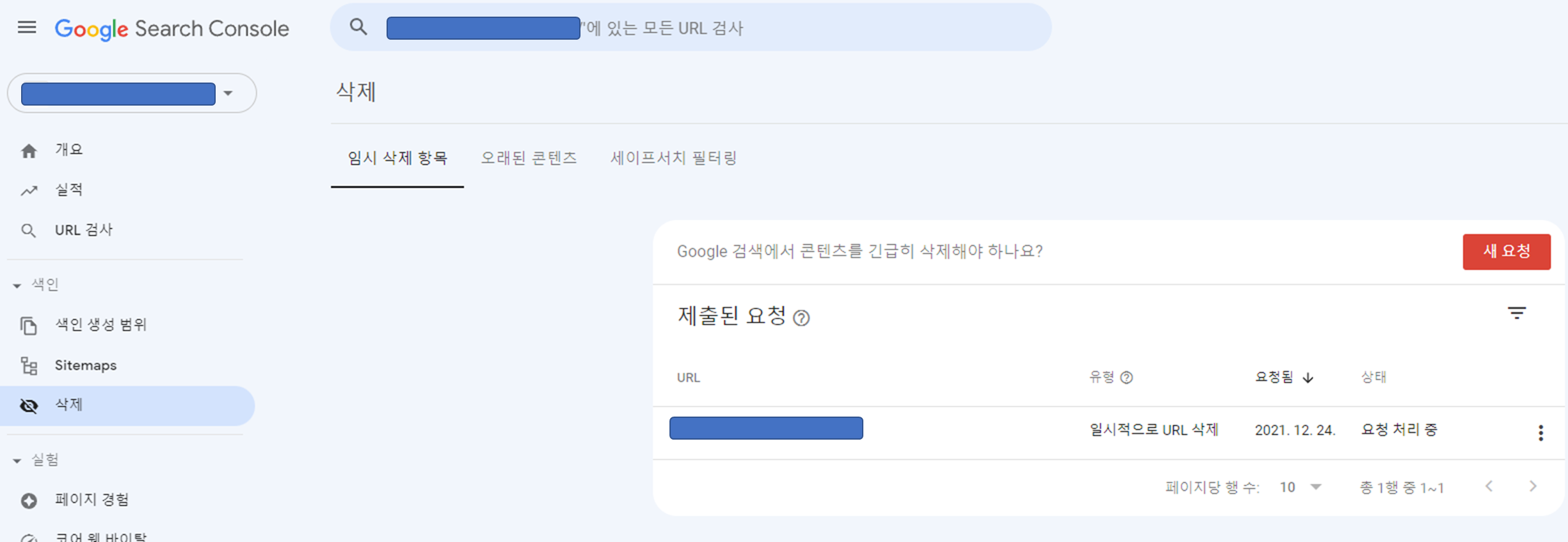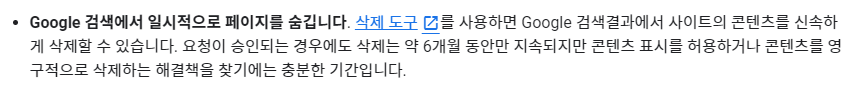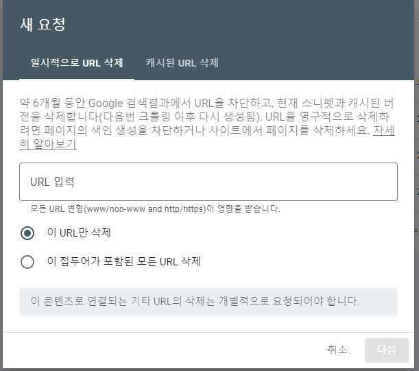 두 가지 요청을 할 수 있는데 일시적으로 URL 삭제와 캐시된 URL삭제가 있는데