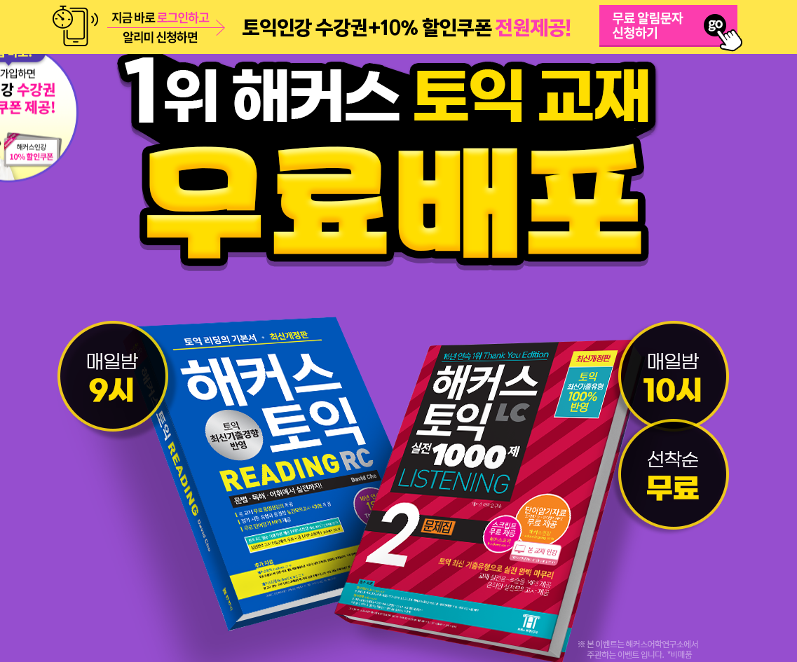 [1위 해커스, 토익교재 무료배포] 올 겨울방학, 시험에 나올만한 문제로 공부하자! 매일 선착순 한정! 해커스에서 토익교재 무료로 쏜다! (*비매품) - 매일 밤 9시/10시 선착순 배포 - 해커스 토익