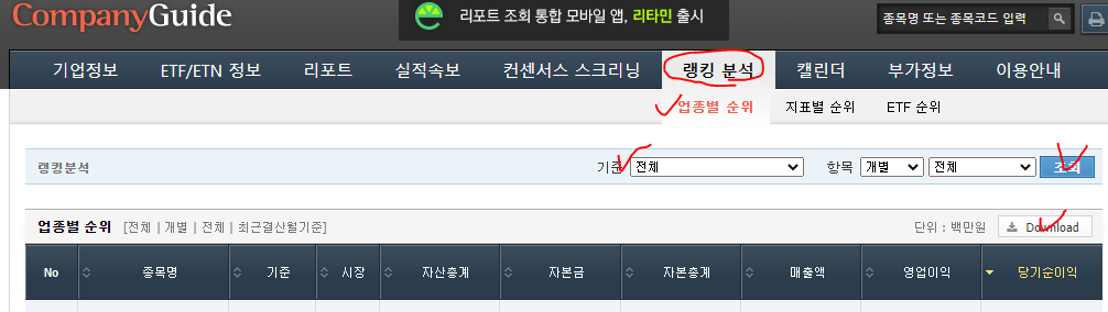랭킹 분석 → 업종별 순위→기준 '전체'→조회→다운로드