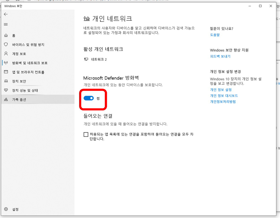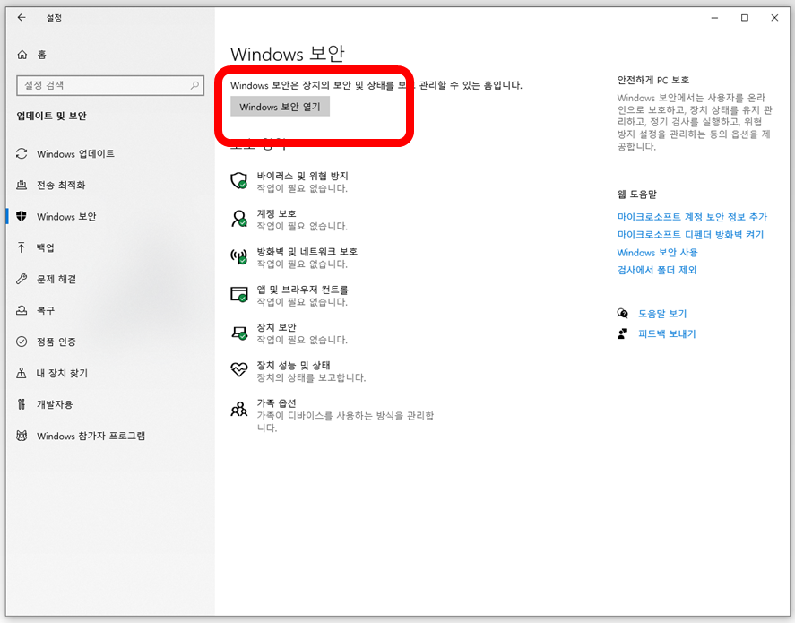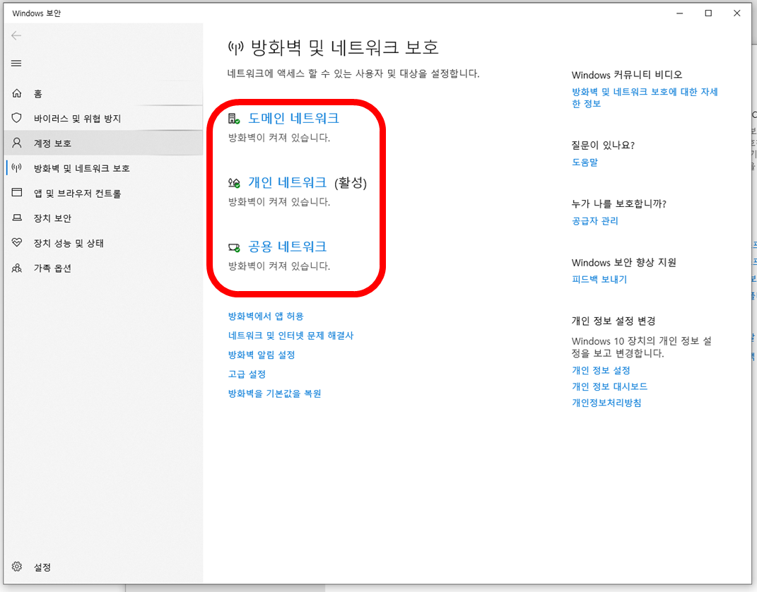 윈도우 보안(방화벽)을 켜서 외부에서 들어오는 바이러스로부터 컴퓨터를 보호합니다.