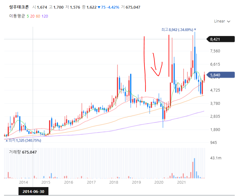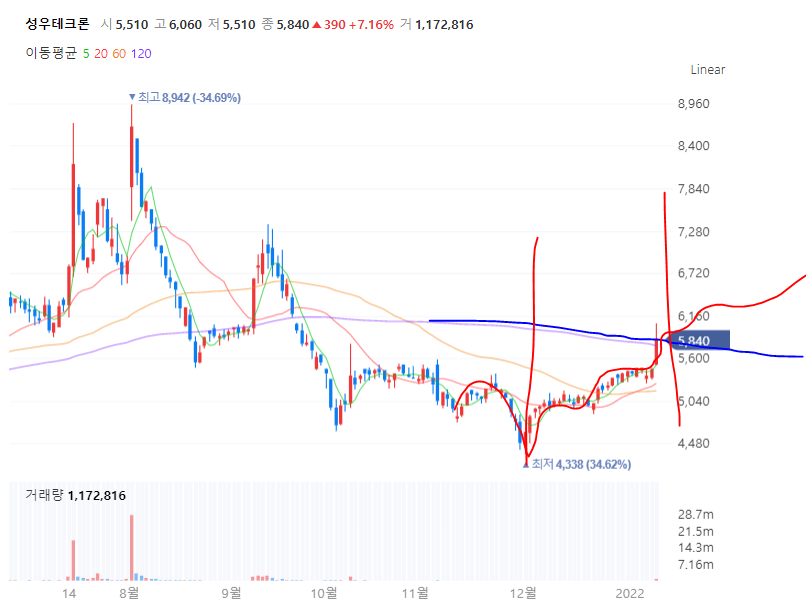 아주 좋은 포지션입니다. 120일선이 완만하고 캔들이 조금 아쉽지만 120일 선에 머물렀습니다. 내일 코스피가 좋다고 하여도 소폭 상승할 거고요. 대량 거래가 아직 업기 때문에 조용히 우상향 갈 것 같습니다.