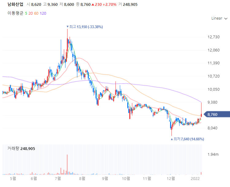 남화산업은 작년 3분기 실적에서 이미 20년 실적을 넘겼구요....그 내용이 아래 차트에서 보시는 바와 같이 13,150원을 찍었구요...21년 전체 실적이 작년보다 높기 때문에 조만간 큰 거래량으로 답이 올듯 합니다.