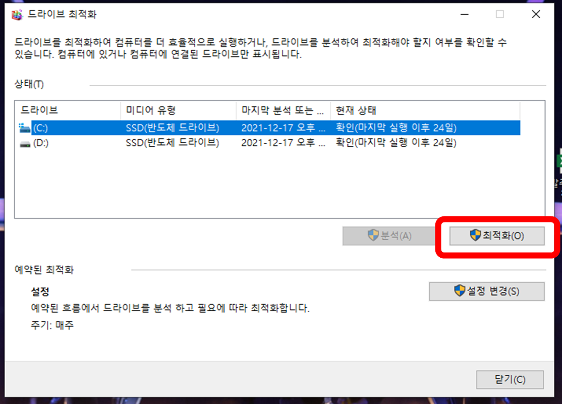 화면과 같이 C 드라이브 D 드라이브 각각 최적화 누르시면 확인을 합니다. 최종적으로 언제 조각을 모았는지...