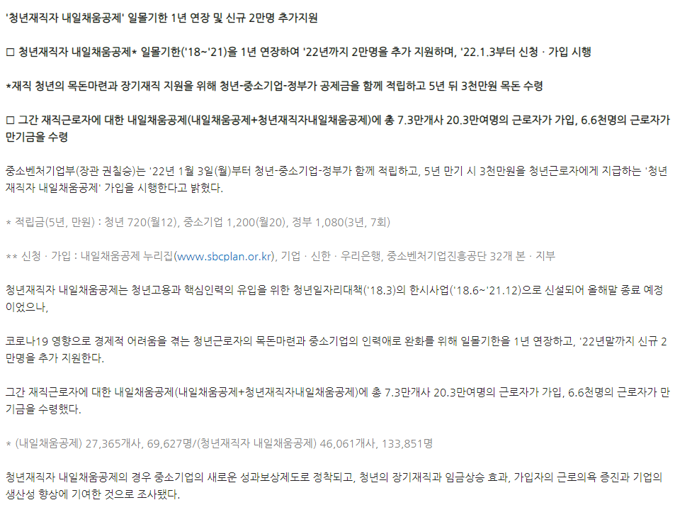 '청년 재직자 내일 채움 공제' 일몰 기한 1년 연장 및 신규 2만명 추가 지원