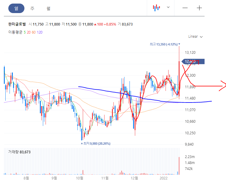 차트가 조금 아쉽습니다. 그래도 상승의 여지는 남겨 놓은 것이 120일선을 계속 밟고 있었습니다.