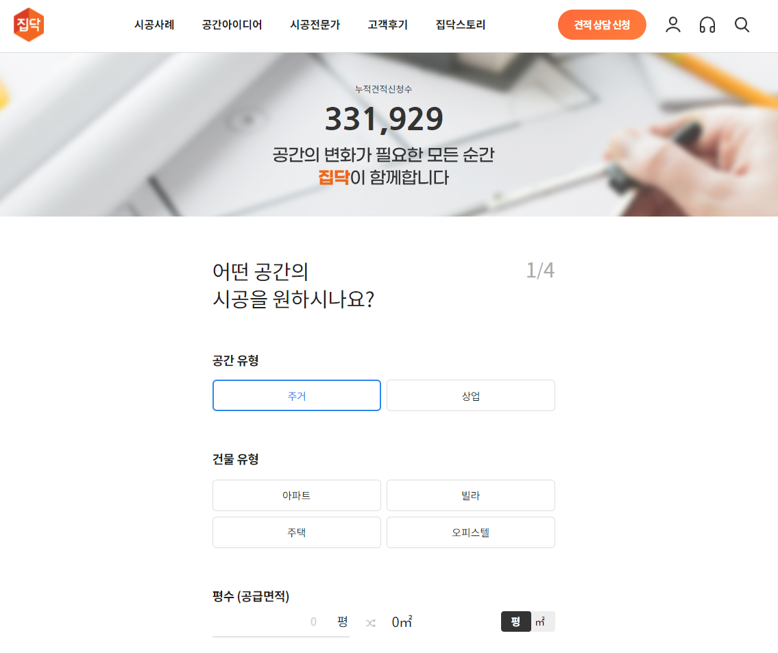 인테리어 무료 견적 신청 국내 인테리어 공사 실적 NO.1 10분에 1명씩 찾고 있는 집닥에 맡겨보세요. 집닥만의 차별화된 서비스로, 인테리어 공사의 모든 고민을 해결해 드립니다.