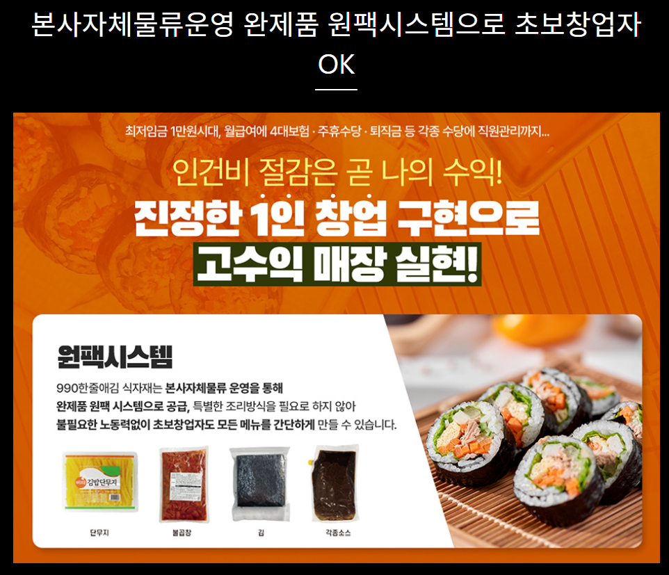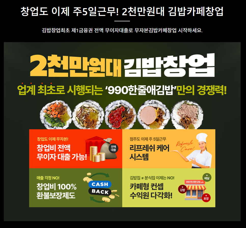 2천만원대 김밥카페창업(무이자 100% 전액대출)으로 주5일 근무창업을 실현하시면됩니다!
