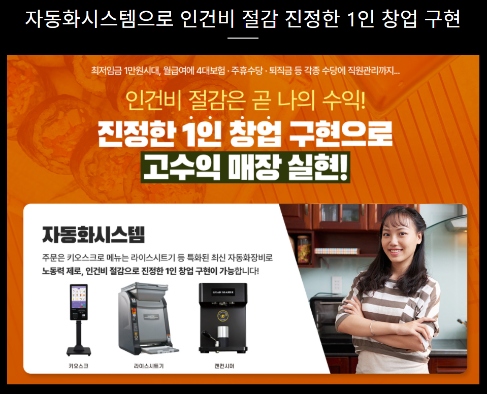 990한줄애김밥은 본사 자체 물류운영을 통한 완제품 원팩제공으로 초보창업자 OK! 주문은 키오스크, 메뉴는 라이스시트기 등 자동화시스템으로 노동력제로, 인건비절감 1인창업 Good!