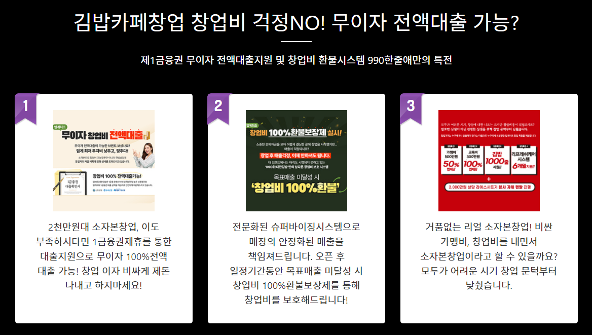 비싼 가맹비, 창업비를 내면서 소자본창업이라고 할 수있을까요? 최저 2천만원대 창업비를 김밥업계 최초 제1금융권제휴를 통한 창업비 100% 무이자 대출지원이 가능합니다.