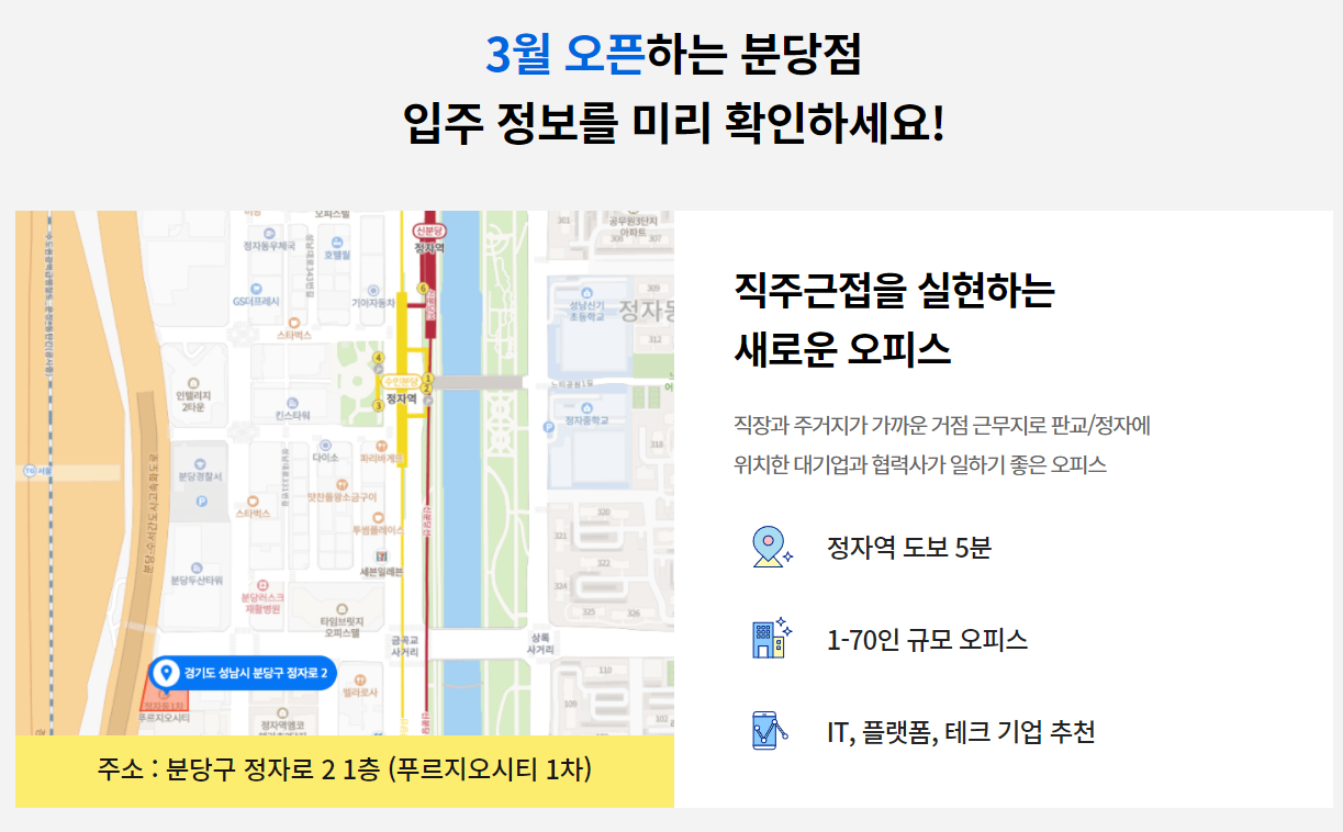 4-50인 경기권 최초 분당 공유오피스 3월 오픈 특가알림 신청 이런 기업에 추천드려요! V 정자역 더블 역세권에 판교, 강남 접근성이 좋은 사무실을 찾는 기업 V 경기권 직주근접 오피스에 거점근