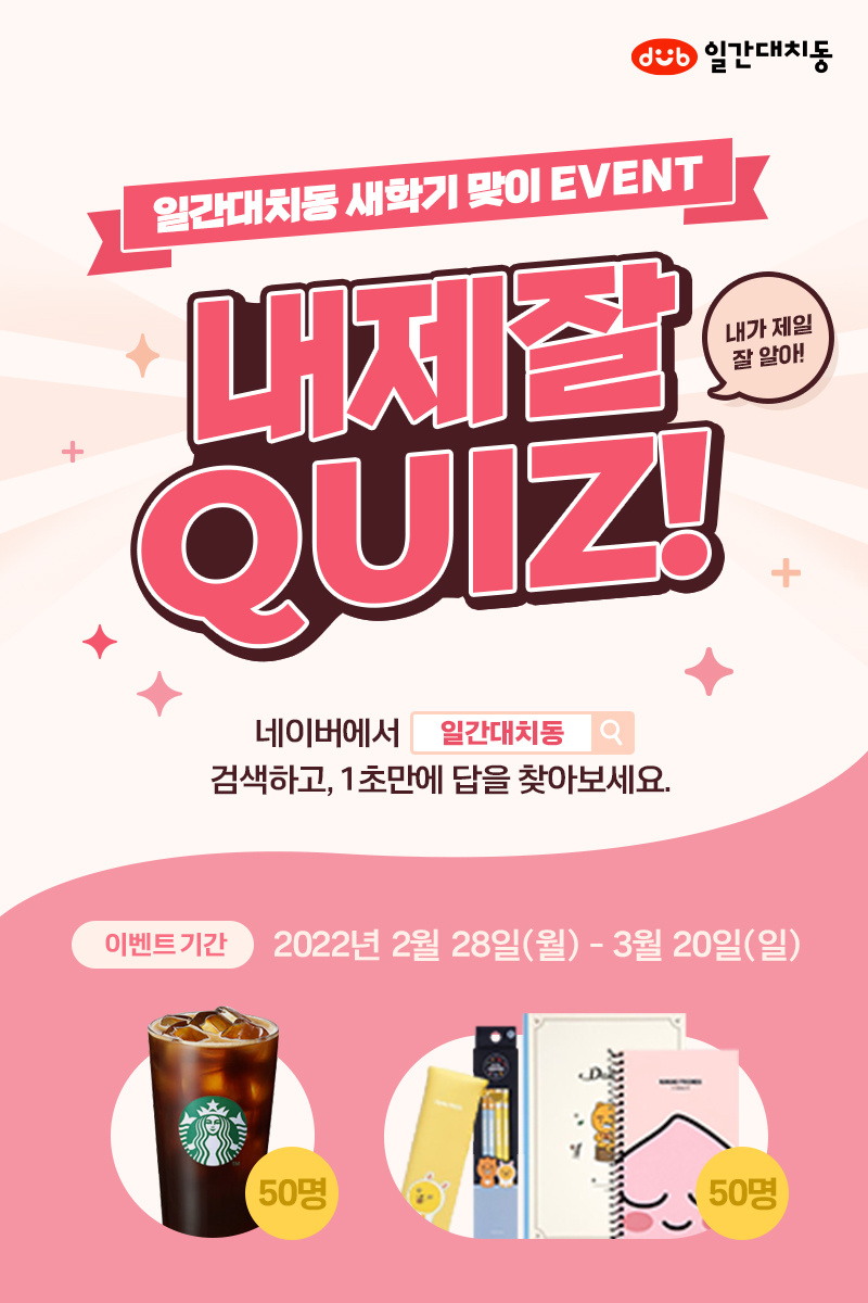 1초만에 정답 찾고, 스벅&카카오 문구세트 받자! Q. 일간대치동은 1명의 튜터와 *명의 친구들이 함께하는 실시간 ***수업 브랜드입니다. 빈칸(*)에 들어갈 정답은 무엇일까요? 네이버에서 ‘일간대