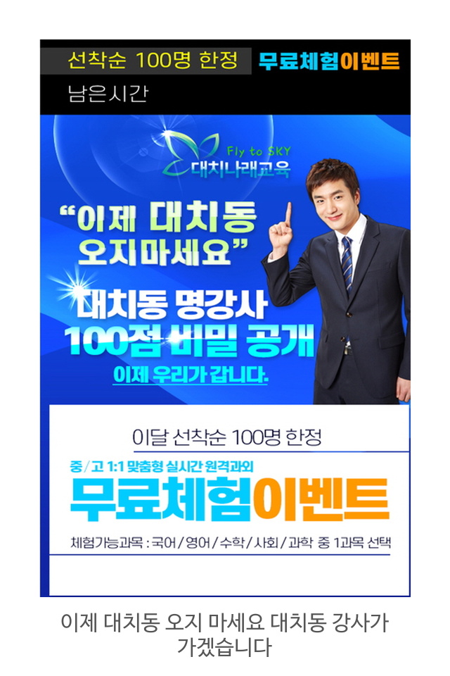 이제 대치동 오지 마세요 대치동 강사가 가겠습니다 1. 대치동 경력의 전문 강사진( 명문대 출신) 이젠 전국 어디서나 교육의 1번지 대치동 수업을 실시간으로 생생하게 공부 할수 있습니다 학생