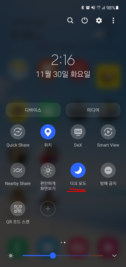 휴대폰의 드래그(화면을 위에서 밑으로 내리면) 설정에 다크모드가 있습니다.