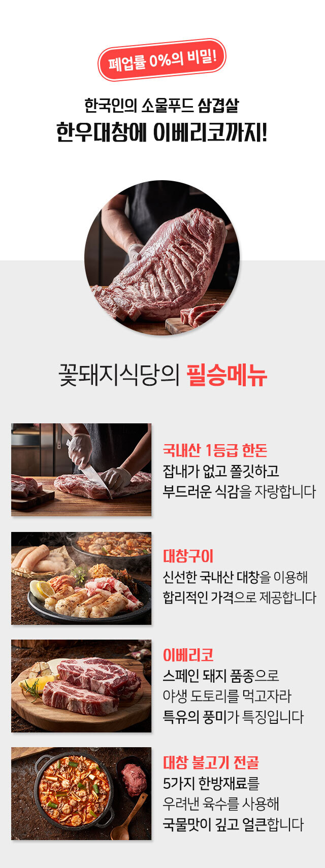 [창업특전 3가지] -가맹비 700만원 본사지원 -무이자창업대출 1,000~5,000만원 신청가능 -업종변경 시 최소비용 오픈지원 [꽃돼지식당 특장점] 1. 실패없는 필승메뉴로 구성! -한국인의 소울푸드 삼겹