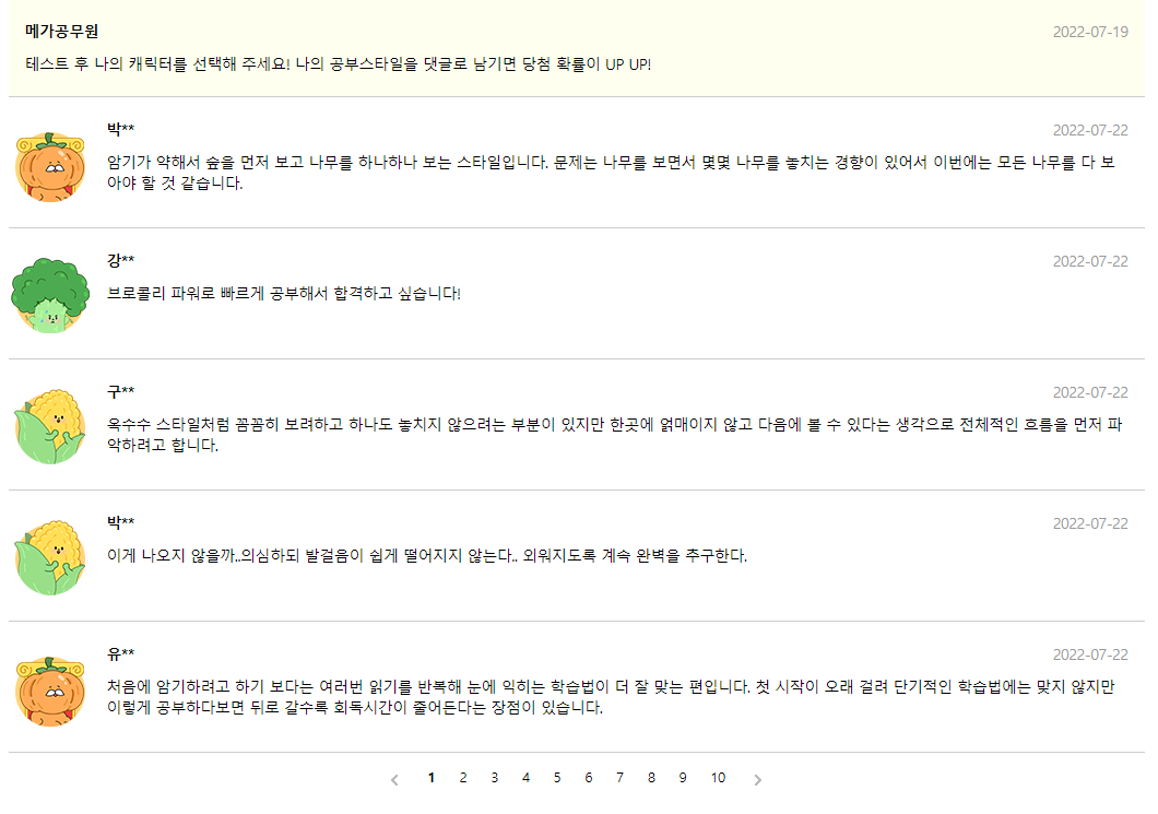 공부 MBTI! 지금 테스트 참여하고 나와 찰떡인 채소 캐릭터를 확인해보세요.