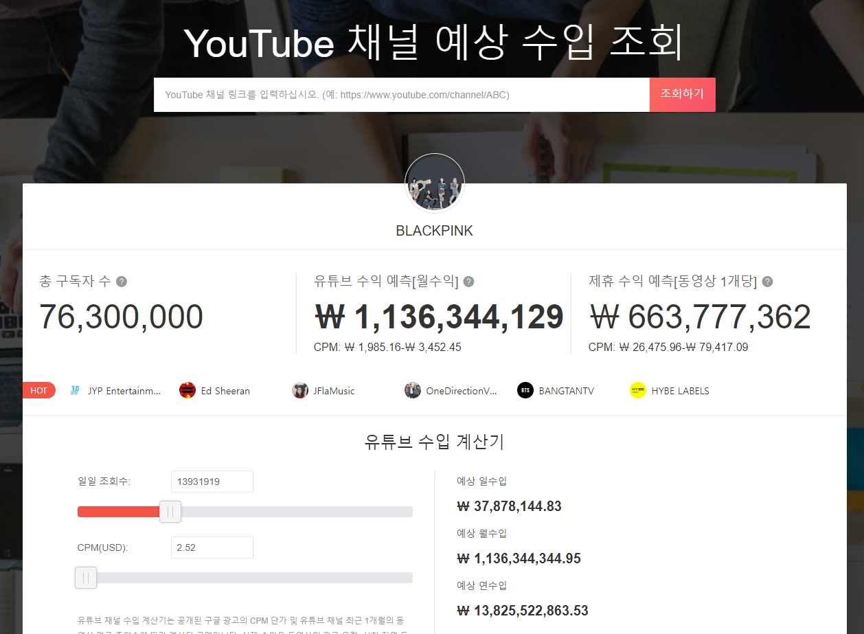 아래는 유튜버 채널 예상 수입 조회 하는 사이트 입니다.