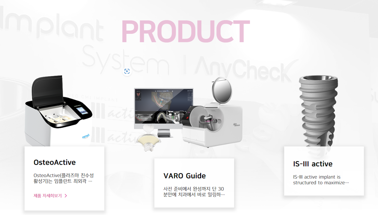 이외에도 임플란트 동요도 측정기 ‘Anycheck’와 신개념 디지털 임플란트 가이드인 ‘바로가이드‘ 같은 혁신적인 신제품을 끊임없이 출시하면서 치의학 의료기술 발전에 공헌하고 있습니다.