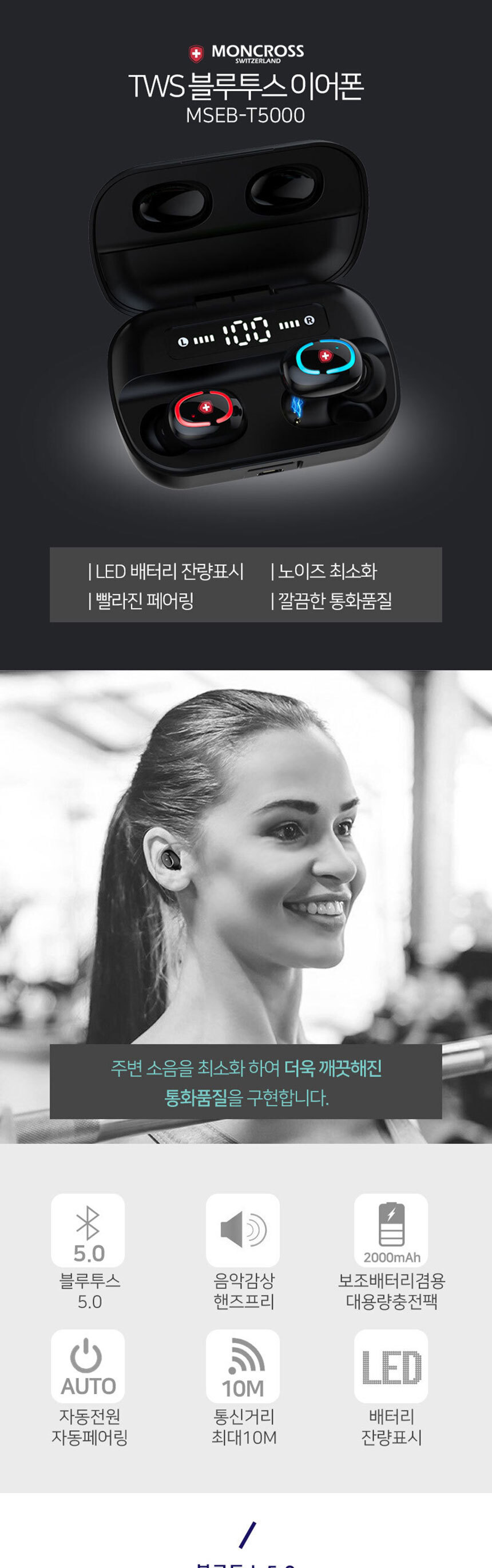 UUU몰 몽크로스 블루투스 무선 이어폰 T5000 커널형 페어링 이어셋 보조배터리겸용