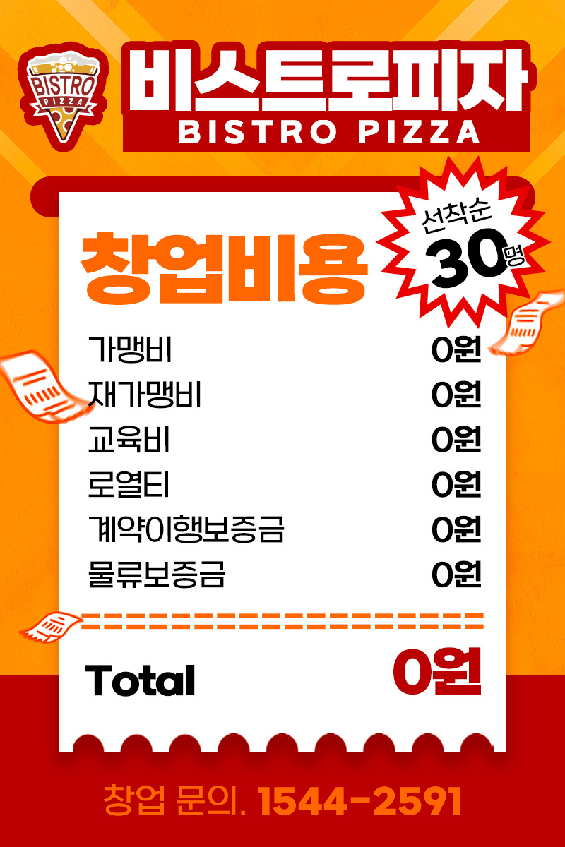 비스트로피자 총 창업비용 2,614만원부터 최대 배달 상권 제공