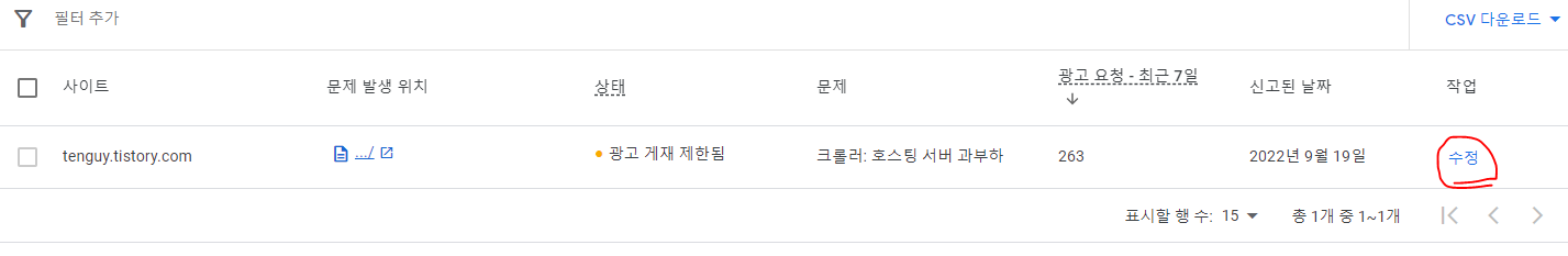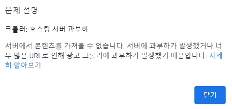 원인 : 크롤러 호스팅 서버 과부하(블로그에 설정된 서치 오류가 많아서 광고가 적절하게 들어가지 않음)